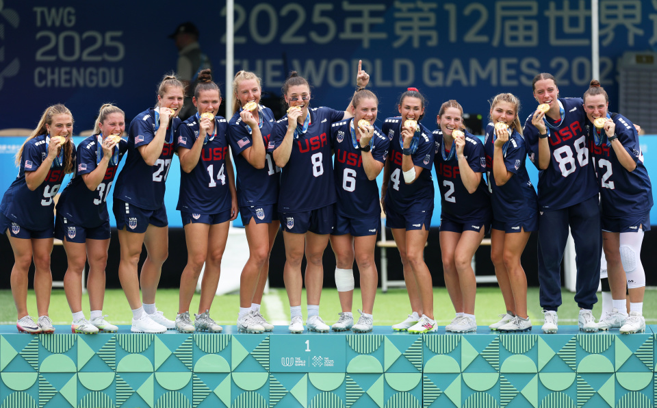 当日,在四川省成都七中东部学校田径场举行的2025年成都世运会女子棍网球金牌赛中,美国队16比8战胜加拿大队,夺得金牌。